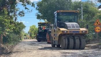 Рабочие с помощью спецтехники утрамбовывают дорогу, подготавливая её к дальнейшей асфальтировке. Перед дорожными работами установили предупреждающие знаки.