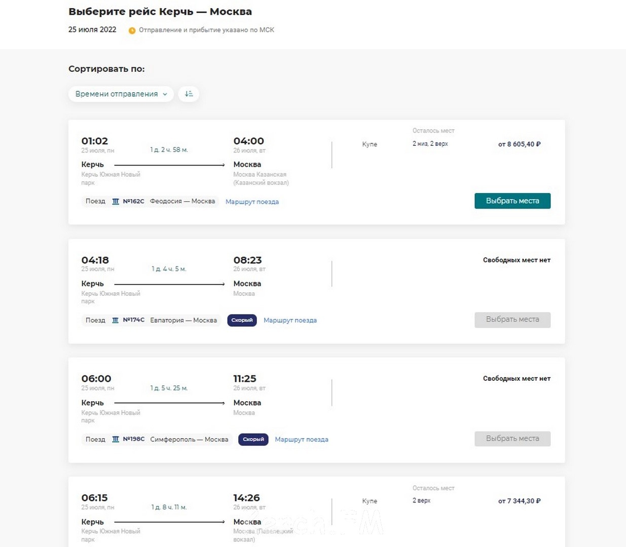 Редакция промониторила стоимость билетов от Керчи до Москвы на сегодня. Самый дешевый билет за 7344, 30 рублей на верхней полке в купе. На последние дни августа билетов как не было так и нет.