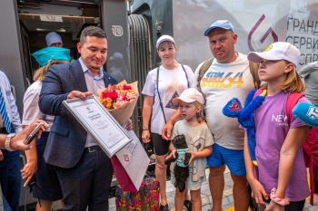 Пассажиров встретили представители компании-перевозчика «Гранд Сервис Экспресс» и Министерства курортов и туризма Республики Крым, которые вручили семье сертификат на бесплатную поездку в Крым и обратно, которую они могу использовать в течение года (на четверых), а также - памятные подарки.