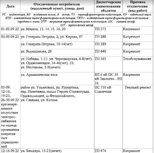 В связи с плановым ремонтом электрооборудования в сентябре в период с 8 до 17 часов будут происходить отключения линий электропередачи согласно нижеприведенному графику. Об этом сообщает ГУП РК «Крымэнерго», - передает Керчь.ФМ.