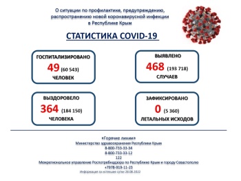 По данным Межрегионального управления Роспотребнадзора по Республике Крым и городу Севастополю за 28 августа 2022 года на территории Республики Крым зарегистрировано 468 случаев новой коронавирусной инфекции, всего выявлено 193 718 положительных на Covid-19. Об этом сообщает пресс-служба Минздрава Крыма, - передает Керчь.ФМ.