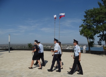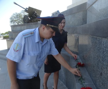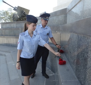 Сотрудники полиции неспешным шагом прошествовали к Обелиску Славы Бессмертным Героям. Почтив память погибших воинов минутой молчания, полицейские возложили цветы к мемориальному комплексу.