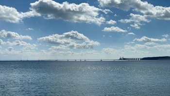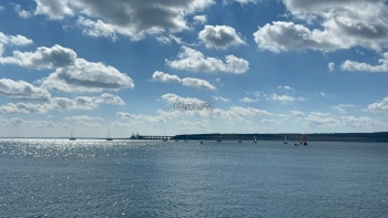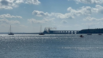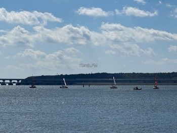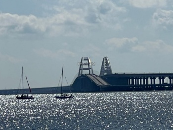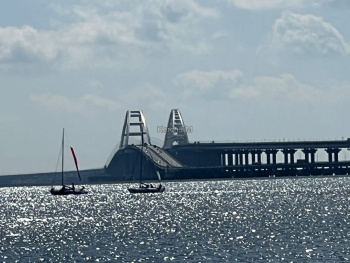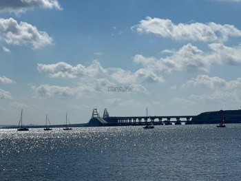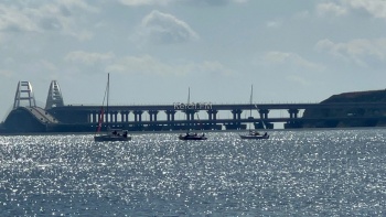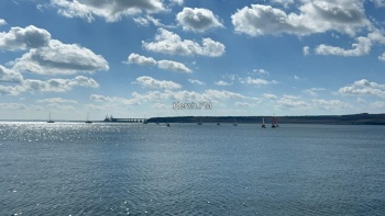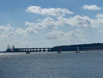 Яхты, в сопровождении моторных лодок красиво прошли вдоль набережной, а потом сделав круг, ушли в сторону пролива вдоль Крымского моста.