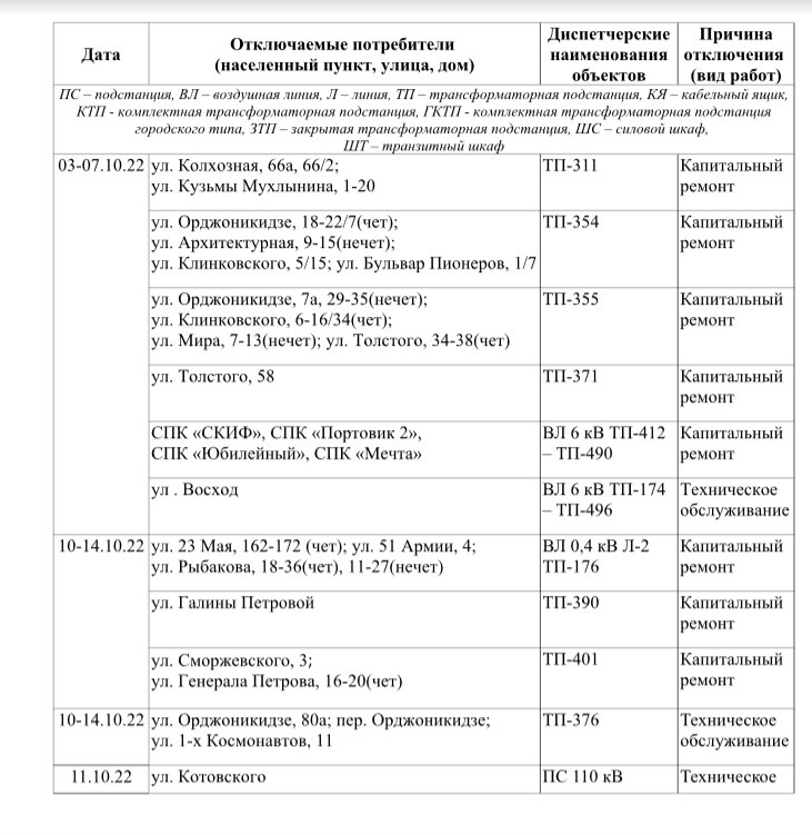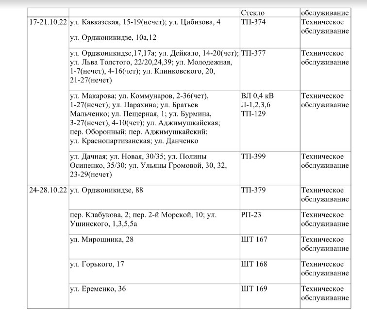 В связи с плановым ремонтом электрооборудования в октябре в период с 8 до 17 часов будут происходить отключения линий электропередачи согласно нижеприведенному графику. Об этом сообщает ГУП РК «Крымэнерго», - передает Керчь.ФМ.