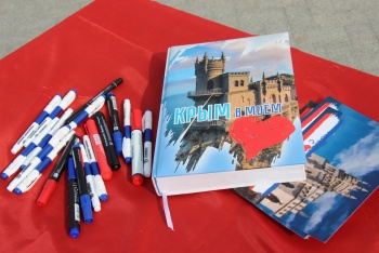 Керчане оставили пожелания на элементе государственной символики, подписали поздравительные открытки «Привет из Крыма», которые будут отправлены в разные субъекты Российской Федерации.
