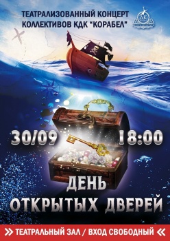 «В ДК «КОРАБЕЛ» спрятаны сокровища. 30.09 #день_открытых_дверей и это идеальная возможность для всех отыскать таинственные дары! Но это большой секрет! Никому не говорите, иначе злобные пираты узнают и постараются Вам помешать! Они думают, что сокровища - это золото и бриллианты, но это ведь не так! Зернышко таланта - вот самый ценный в мире подарок!», - говорят во Дворце культуры о предстоящем мероприятии.