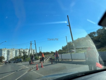 Здесь специалисты перекрыли одну полосу для движения из-за работ на ж/д путях. Движение осуществляется реверсивно, его регулируют рабочие.
