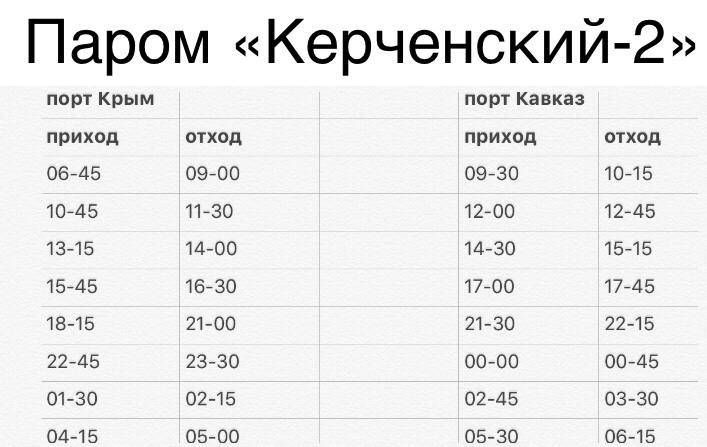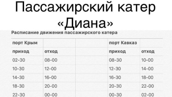 «Паром «Керченский -2», вместимостью 61 пассажир и 15 а/машин «Газель». Приходит в порт «Крым» в 6:45, отправление в 9:00. Время в пути полчаса, ожидание в порту «Кавказ» 45 минут. Следовательно, из порта «Кавказ» паром отправляется в 10:15. И далее по расписанию. Пассажирский катер «Диана», вместимостью 150 пассажиров, отправляется из порта «Крым» в 8:00, из порта «Кавказ» в 10:00. Время пути -30 минут. Катер следует согласно расписания», - говорится в сообщении.