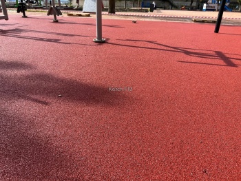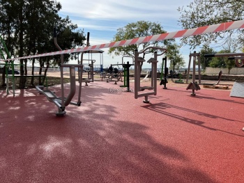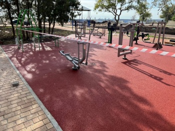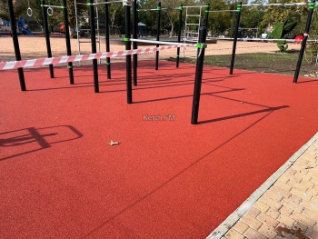 Рабочие уложили новое резиновое покрытие на спортивной площадке с тренажёрами. Оно пока закрыто для посетителей и ограждено сигнальными лентами.