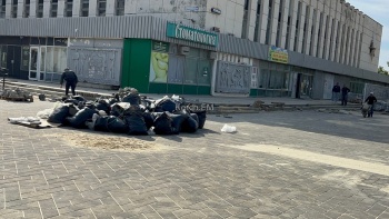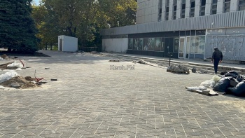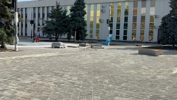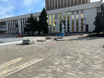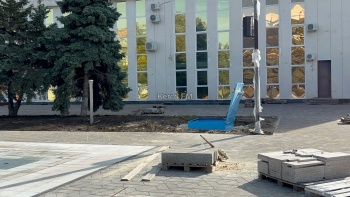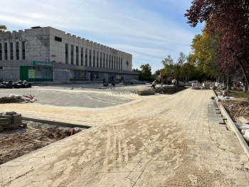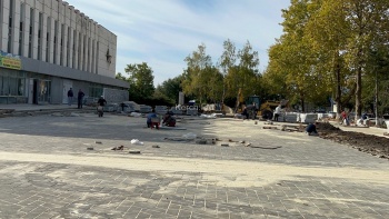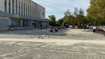 Активно продолжаются работы у Дворца Спорта - здесь укладывают плитку.