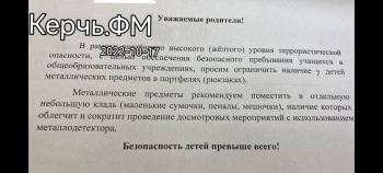 Начало учебной недели в Керчи стартовало опять с эвакуации. Вчера всем родителям и детям разослали дополнительные требования к обеспечению безопасности: минимум металлических предметов, проход через рамку, и другое, - передает Керчь.ФМ.