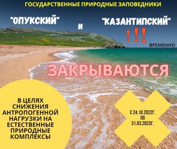 Государственные природные заповедники «Казантипский» и «Опукский» с 24.10.2022г. по 31.03.2023г закрываются для посещения туристов. Об этом сообщает ФГБУ «Заповедный Крым», - передает Керчь.ФМ.