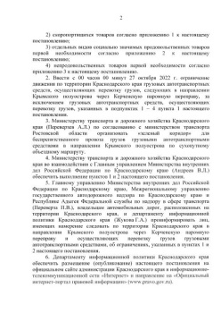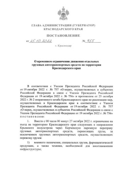 Согласно документу, с 00:00 27 октября вводится ограничение на въезд и передвижение по территории Краснодарского края грузовых автотранспортных средств, следующих в направлении Крымского полуострова через Керченскую паромную переправу.