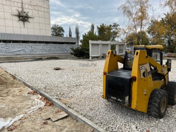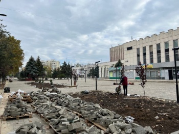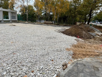 Сегодня, 27 октября рабочие высаживали в клумбы кустарники и деревья. Также часть территории у доски почета оставили под парковку автомобилей. Здесь установили бордюры и засыпали щебень. Территорию готовят под асфальтировку.