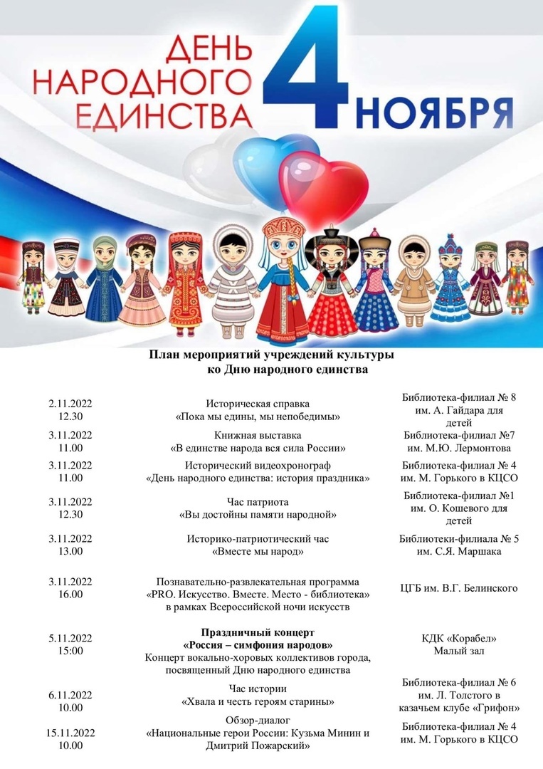 В Керчи опубликовали план мероприятий, посвященный празднованию Дня народного единства. Так, ряд мероприятий пройдет в библиотеках города, а праздничный концерт состоится в ДК «Корабел», - передает Керчь.ФМ.