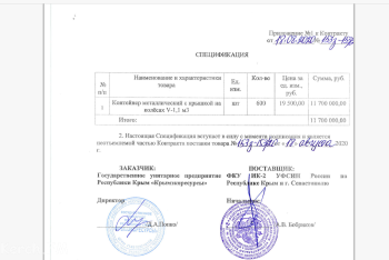 18 августа 2020 года Крымэкоресурсы закупил у ФСИН 600 контейнеров 1, 1 куб по 19500, 00 за штуку на 11 700 000, 00 рублей. Разница с прайс-листом 300 тысяч.