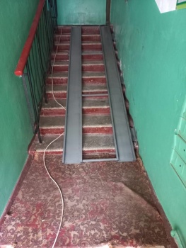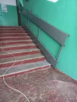 Сооружение для передвижения коляски установлено на входе в подъезд МКД на ул. Л. Толстого, 130. А в самом подъезде смонтирован откидной пандус, который будет использоваться при необходимости, а в поднятом состоянии не будет мешать жильцам.