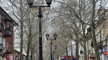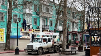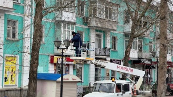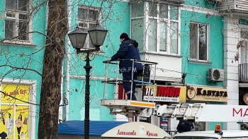 В Керчи рабочие украшают центральную улицу к новогодним праздникам. Как и в прошлом году, вместе с гирляндой на фонарях появились большие светящиеся снежинки и олени, - передает Керчь.ФМ.