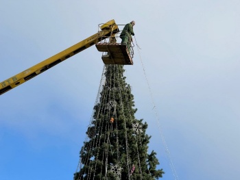 Так, 15 декабря, рабочие завершали установку праздничной иллюминации с помощью техники. Осталось повесить игрушки, которые в этом году делают школьники самостоятельно.