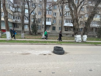 Препятствие решили обозначить двумя покрышками. Ранее на участке были установлены знаки, и даже велись работы, но видимо, они не помогли.