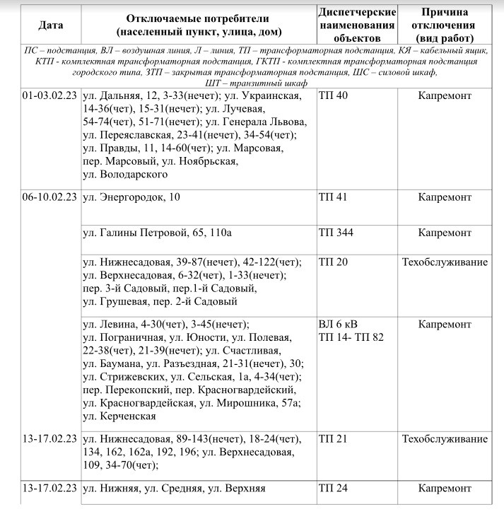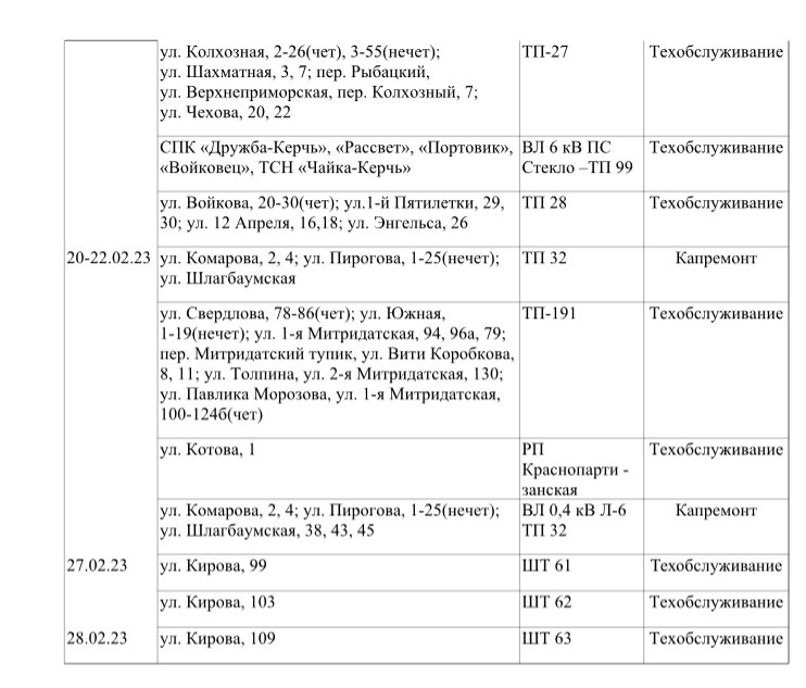 В связи с плановым ремонтом электрооборудования в феврале в период с 8 до 17 часов будут происходить отключения линий электропередачи согласно нижеприведенному графику. Об этом сообщает ГУП РК «Крымэнерго», - передает Керчь.ФМ.