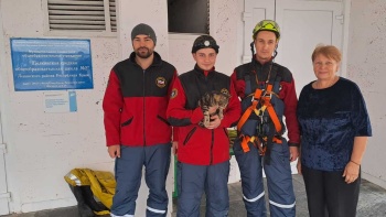 Позднее, в этот же день поступило сообщение о том, что в г. Щёлкино (Ленинский район) в вентиляционной шахте школы находится котёнок.