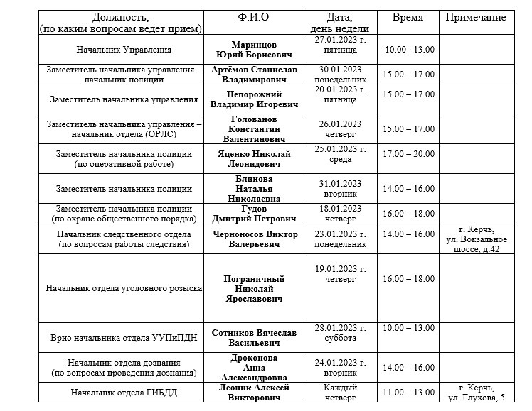 Управление МВД России по г. Керчи информирует о приеме граждан руководящим составом Управления в январе 2023 года, - передает Керчь.ФМ.