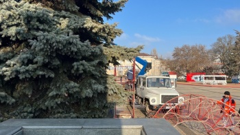 В Керчи 21 января на площади Ленина демонтируют главную новогоднюю ёлку города. Рабочие снимают гирлянду и декорации рядом с ней, - передает  Керчь.ФМ.