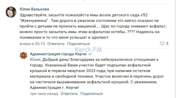 «Добрый день! Благодарим за небезразличное отношение к городу. Указанный Вами участок будет подсыпан асфальтной крошкой в первом квартале 2023 года, при наличии остатков материала и свободной техники. Участок включен в перечень дорог на частичное выравнивание асфальтной крошкой. С уважением, Администрация г. Керчи!», - сообщило ведомство.