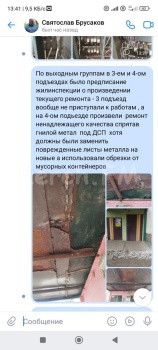 «Входы в подъезды у нас разваливались. Жилинспекция обязала отремонтировать и даже сроки дала. Отремонтировали - внешне покрасили, а гниль обшили на улице плитами ОСБ. ОСБ - на улице! И покрасили черной краской имитируя качество.