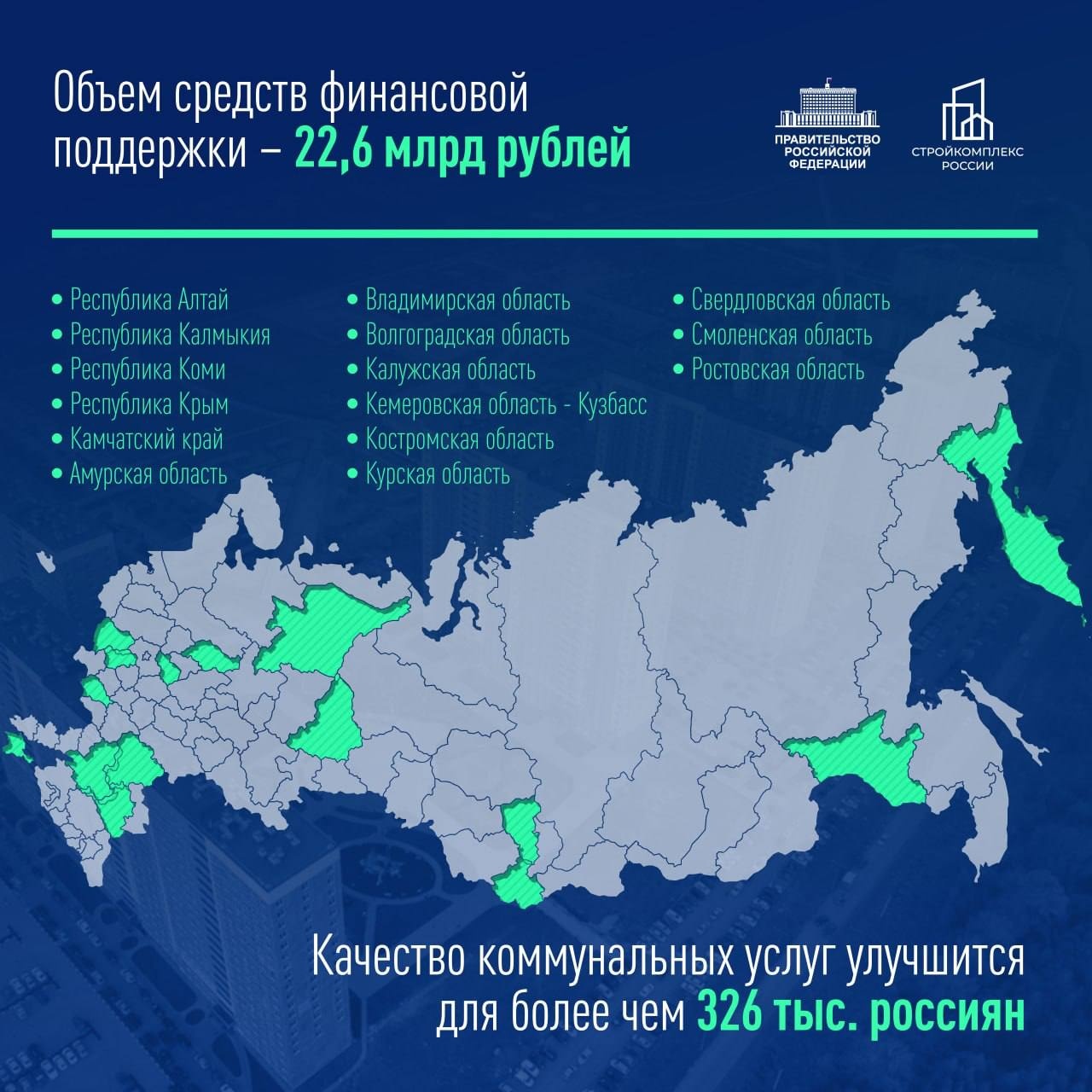 «Сегодня на Штабе с регионами утвердили 15 региональных программ модернизации ЖКХ, которые получат федеральную поддержку. Ее общий размер - 22, 6 млрд рублей. На эти средства обновим и построим порядка 2 400 км сетей. В результате более качественные коммунальные услуги будут получать 326 000 человек в 15 регионах страны», - рассказал Марат Хуснуллин.
