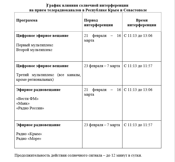 В Республике Крым кратковременные помехи на экранах телевизоров возможны с 21 февраля до 16 марта с 11:13 до 13.06. Продолжительность помех — от нескольких секунд до 12 минут в сутки.