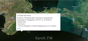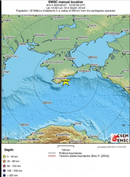 По данным международного ресурса карты землетрясений сила ударов достигала 4, 4 баллов, координаты: 44°31'12''с.ш., 34°30'00''в.д.. Глубина: 20км.