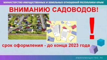 Завершить оформление земельных участков, занятых садовыми некоммерческими товариществами на территории Крыма необходимо до конца этого года. Об этом сообщила министр имущественных и земельных отношений РК Лариса Кулинич, - передает Керчь.ФМ.