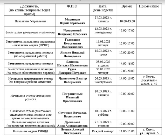 Управление МВД России по г. Керчи информирует о приеме граждан руководящим составом Управления в марте 2023 года, - передает Керчь.ФМ.