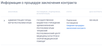 Даже здесь закупки прошли со странностями. Заявку подал только один участник - это "КРЫМСКИЙ РЕСПУБЛИКАНСКИЙ ЦЕНТР МЕДИЦИНЫ КАТАСТРОФ И СКОРОЙ МЕДИЦИНСКОЙ ПОМОЩИ". Из частных скорых в тендере никто не участвовал. И даже при таком отсутствии конкуренции скорая «сбила» цену до 300 696, 00 рублей.