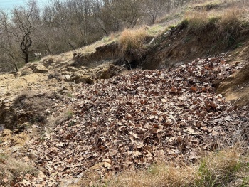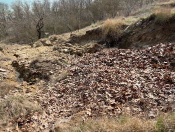 Его прикрыли листвой, но оползень свежий и люди боятся, что он после осадков вновь вырастет в размерах.