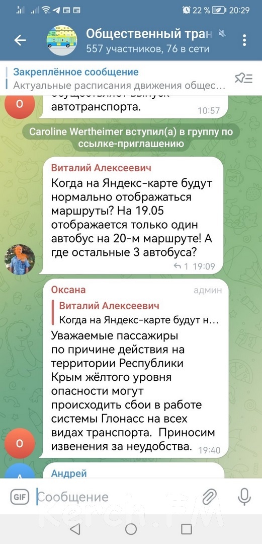 Согласно Приказу Минтранса №413 от 07.10.2020 автобусы категории М2 и М3 (до 5 тонн и до 8 человек, и более 5 тонн и более 8 человек соответственно, - ред) должны быть оснащены аппаратурой спутниковой навигации ГЛОНАСС или ГЛОНАСС/GPS. Но, как сообщают керчане далеко не все автобусы отображаются на карте. Представители администрации, отвечающие за коммуникацию в паблике, сообщали ответы руководителей предприятий-перевозчиков, которые объясняли отсутствие ГЛОНАСС перебоями с интернетом. С недавнего времени отсутствие ГЛОНАСС на некоторых автобусах объясняют желтым уровнем опасности. Почему желтый уровень влияет на одни автобусы, и абсолютно не влияет на другие, вообще никто пояснить не может.