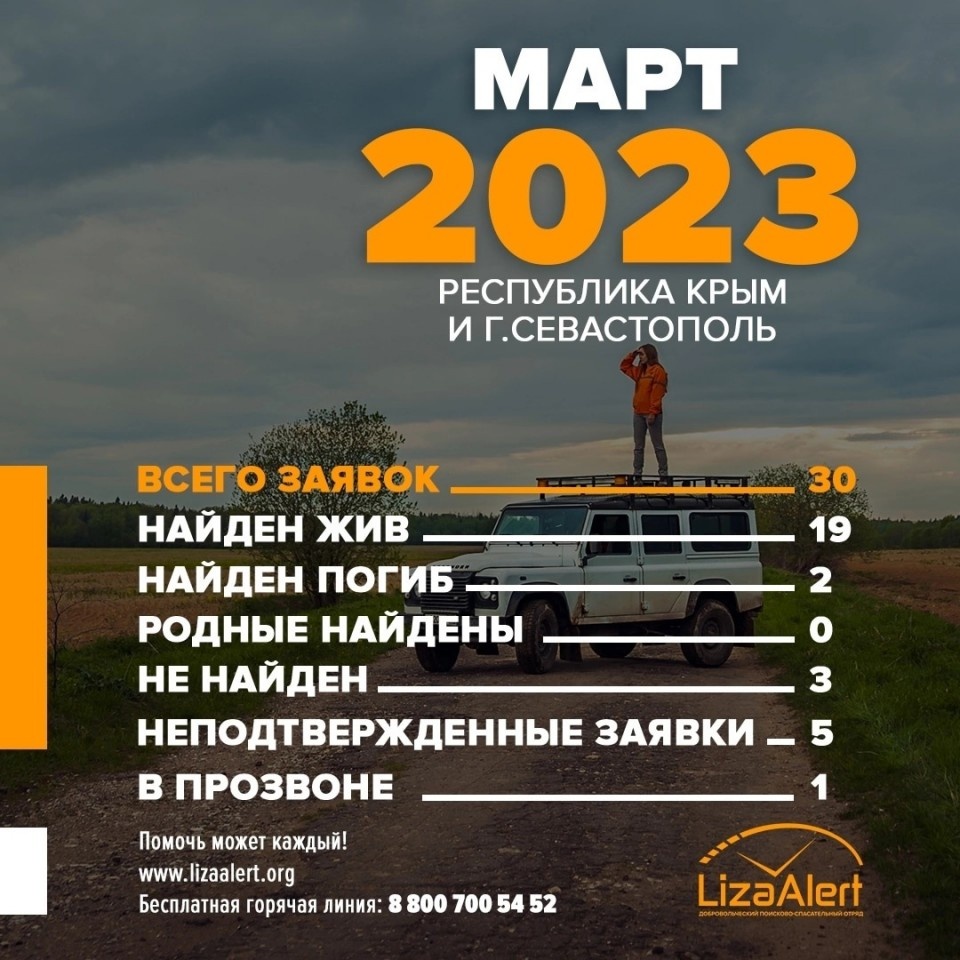 В поисковый отряд «ЛизаАлерт Крым» за март поступило 30 заявок на поиск людей. Из них 5 заявок не подтвердилось. Об этом пишет КИА, - передает Керчь.ФМ.