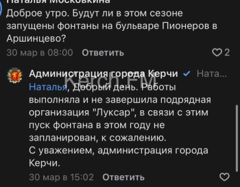 В Керчи на бульваре Пионеров в этом году не будет работать фонтан. Об этом горожанке сообщили в пресс-службе администрации города, - передает Керчь.ФМ.
