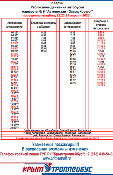 В период поминальных дней, с 22 по 25 апреля, движение автобусов на маршрутах № 21 "Аршинцево - Партизанский" и №8 "Автовокзал - завод "Коралл" будет осуществляться по изменённому графику. Об этом сообщает пресс-служба администрации Керчи, - передает Керчь.ФМ.