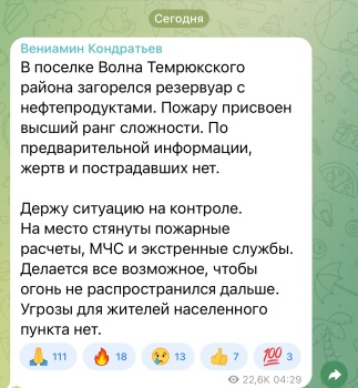 В поселке Волна Темрюкского района загорелся резервуар с нефтепродуктами. Пожару присвоен высший ранг сложности. По предварительной информации, жертв и пострадавших нет.