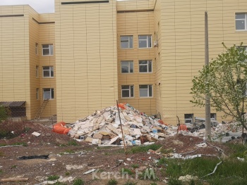 Ремонт завершили только в здании отделения педиатрии №1. Здание инфекционного отделения, которое не эксплуатировалось с осени 2019 года ввиду аварийного состояния, стоит в строительных лесах вокруг окруженное стройматериалами. Капремонт поликлиники в полном разгаре, но уже видны границы работ. Их можно с трудом, но разглядеть среди гор мусора вокруг.