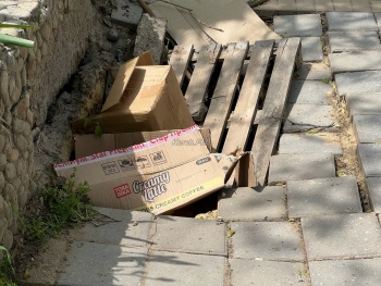 В место провала набросали коробок и деревянных палетов. Видимо, предприниматели решили сделать хоть что-то, в отличие от ответственных.