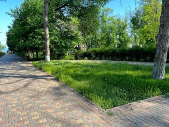 Пустыри на территории парка сильно заросли травой, куча травы и между плиткой на центральных аллеях.