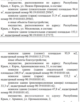 В списке сегодня оказались и керченские объекты. Это квартира по Буденного, здания кафе на берегу институтского пляжа, эллинг и спасательная станция рядом с Молодежным пляжем, а также эллинг и здание рядом с территорией пляжа "Нимфей".