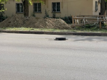 Глубокая яма, которая встречает воителей на дороге по улице Орджоникидзе наконец хоть как-то обозначена для водителей - на нее положили покрышку, - передает Керчь.ФМ.