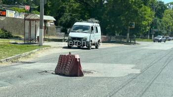 В Керчи на Вокзальном шоссе на проезжей части провалилась дорога. В яму установили пластиковый барьер, - передает Керчь.ФМ.