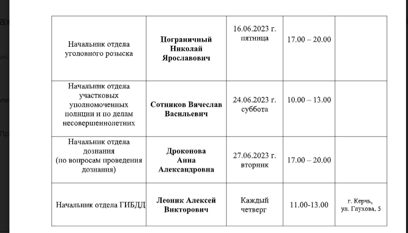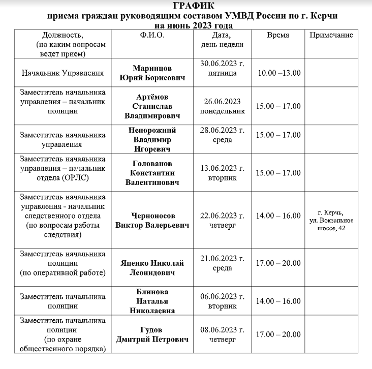 Пресс-служба полиции сообщила график приема руководителями ведомства в июне, - передает Керчь.ФМ.