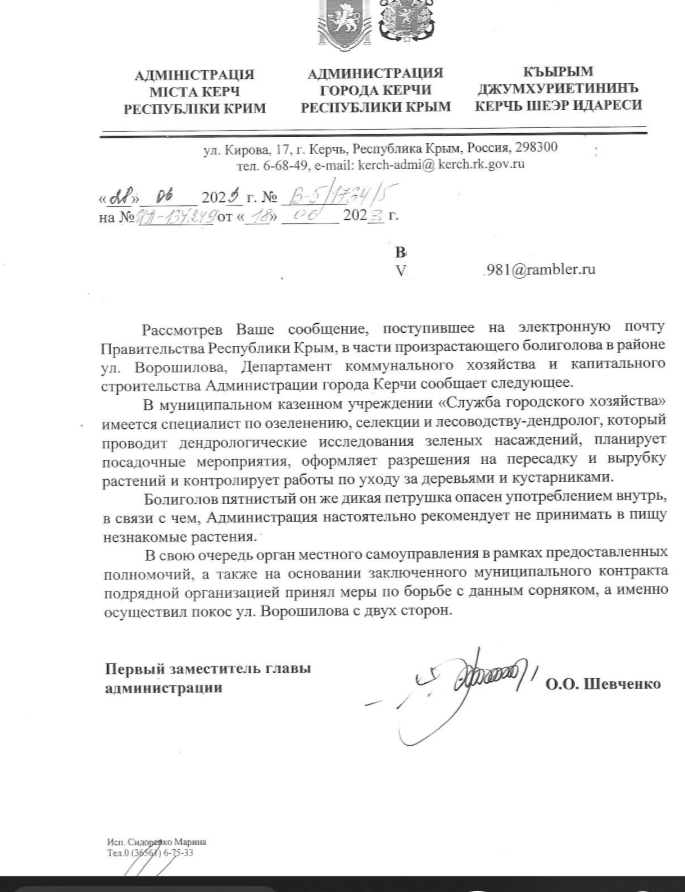 Администрация, вместо того, чтобы разъяснить план по борьбе с болиголовом написала о том, что у них в штате есть специалист по озеленению, селекции и лесоводству-дендролог. К чему прозвучал данный ответ, то ли к тому, что болиголов теперь выращивают в благоустроенных дворах и на территориях с завезенным грунтом, то ли к тому, что это опыты этого дендролога, непонятно. Если бы еще и диплом этого дендролога приложили и фамилию сообщили, чтобы знать, кто это конкретно за бюджетные деньги занимается культивацией ядовитого растения и травит керчан. Или это так составлен ответ. Но того, кто составил и подписал такой ответ за бюджетные деньги, видно сразу - первый заместитель глав администрации ОО Шевченко.